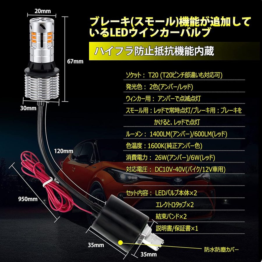 T20 LEDウィンカーバルブ リア アンバー レッド 2色切替 車検対応 スーパーキャンセラー ハイフラ防止 抵抗内蔵 ブレーキ スモール機能 冷却ファン 12V車 テール