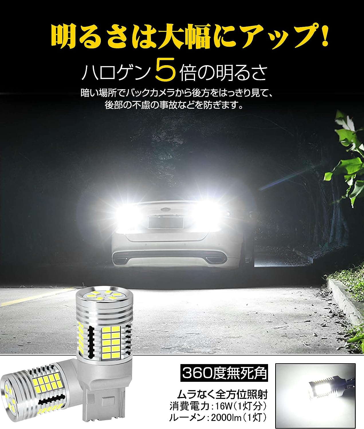 死角のない360度全方位照射仕様で、バック時の視野は純正より広くなります。
